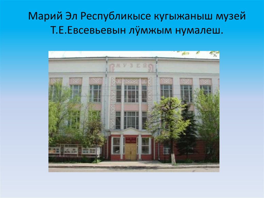 Марий Эл Республикысе кугыжаныш музейТ.Е.Евсевьевын лÿмжым нумалеш.