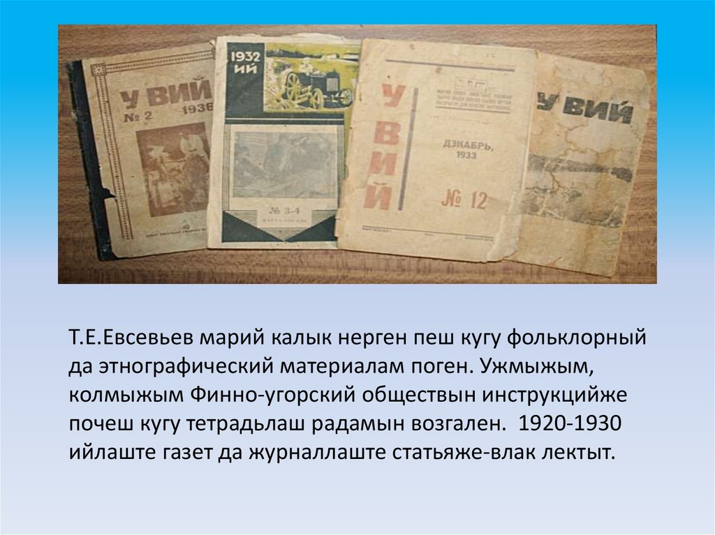 Т.Е.Евсевьев марий калык нерген пеш кугу фольклорныйда этнографический материалам поген. Ужмыжым,