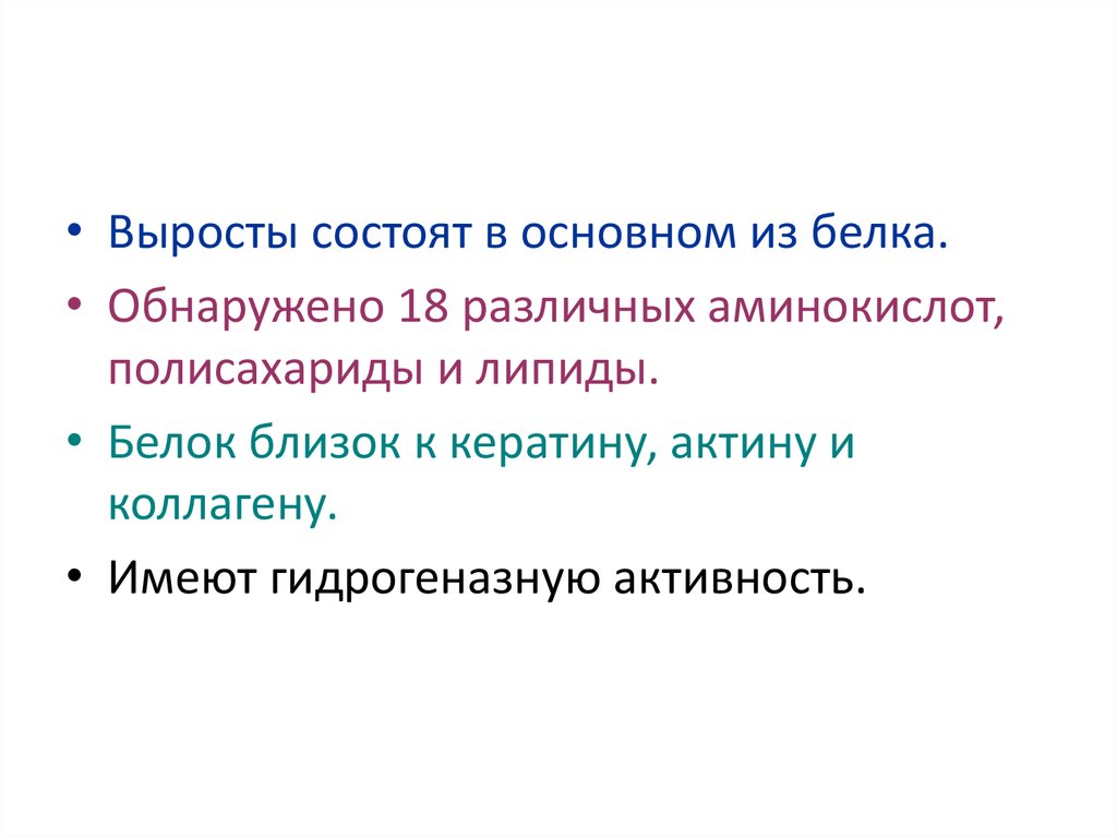 • Выросты состоят в основном из белка.• Обнаружено 18 различных аминокислот,