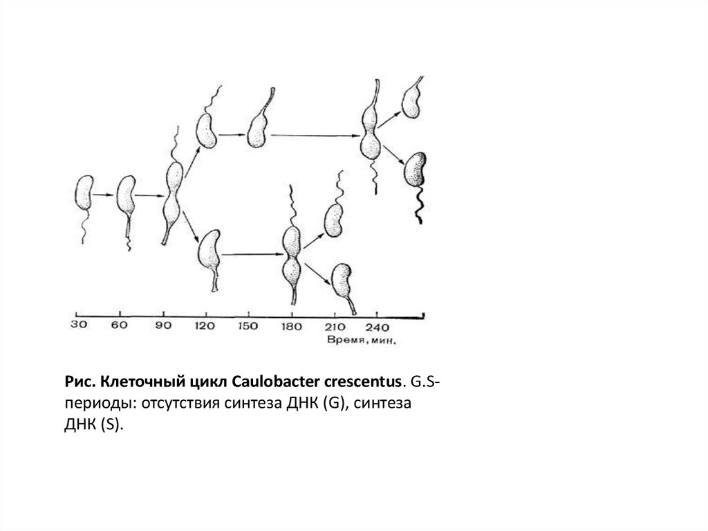 Рис. Клеточный цикл Caulobacter crescentus. G.Sпериоды: отсутствия синтеза ДНК (G), синтезаДНК (S).