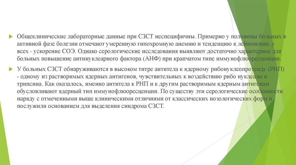 Общеклинические лабораторные данные при СЗСТ неспецифичны. Примерно у половины больных вактивной фазе болезни отмечают умеренную гипохромную анемию и тенденцию к лейкопении, у