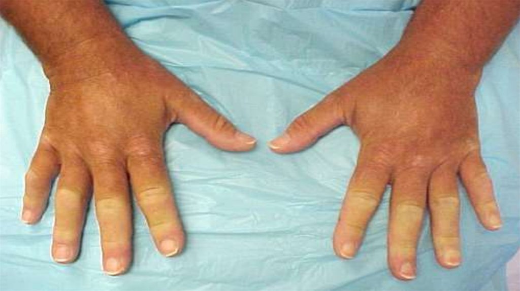 кистей вплоть до развития «сосискообразной» формы пальцев, но эта