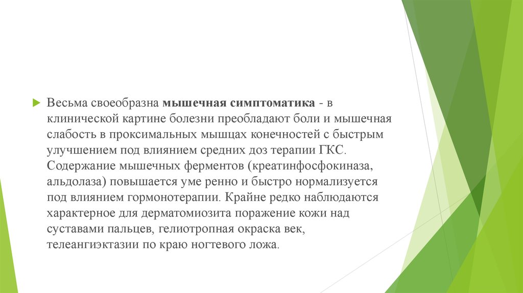 Весьма своеобразна мышечная симптоматика - вклинической картине болезни преобладают боли и мышечная