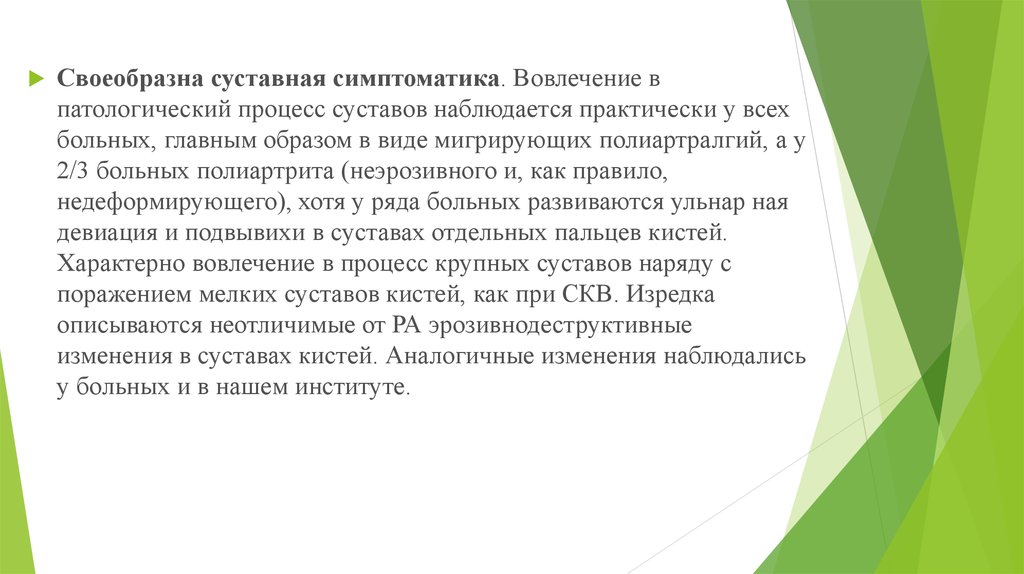 Своеобразна суставная симптоматика. Вовлечение впатологический процесс суставов наблюдается практически у всех