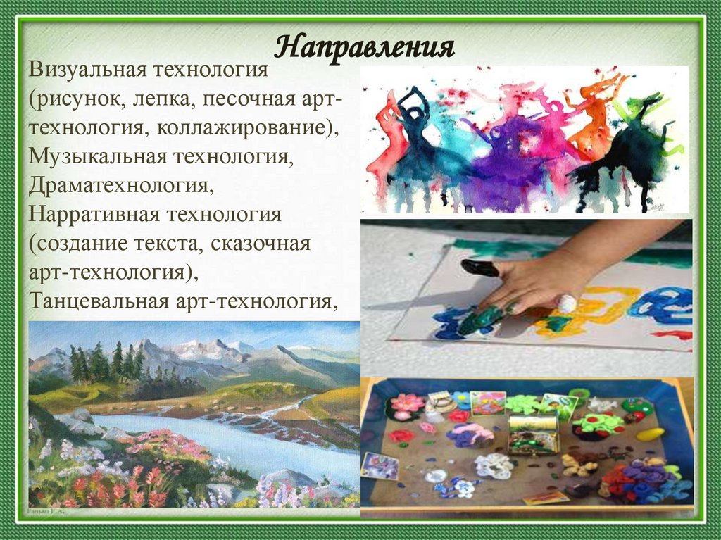 (рисунок, лепка, песочная арттехнология, коллажирование),