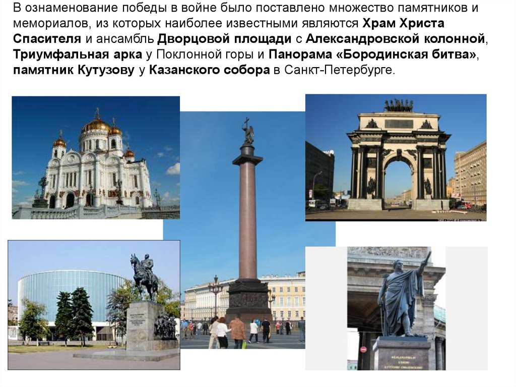 В ознаменование победы в войне было поставлено множество памятников имемориалов, из которых наиболее известными являются Храм Христа