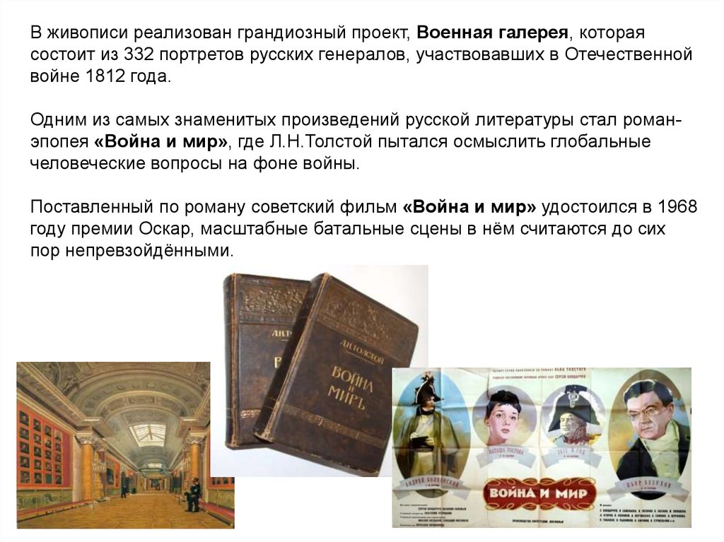 В живописи реализован грандиозный проект, Военная галерея, котораясостоит из 332 портретов русских генералов, участвовавших в Отечественной