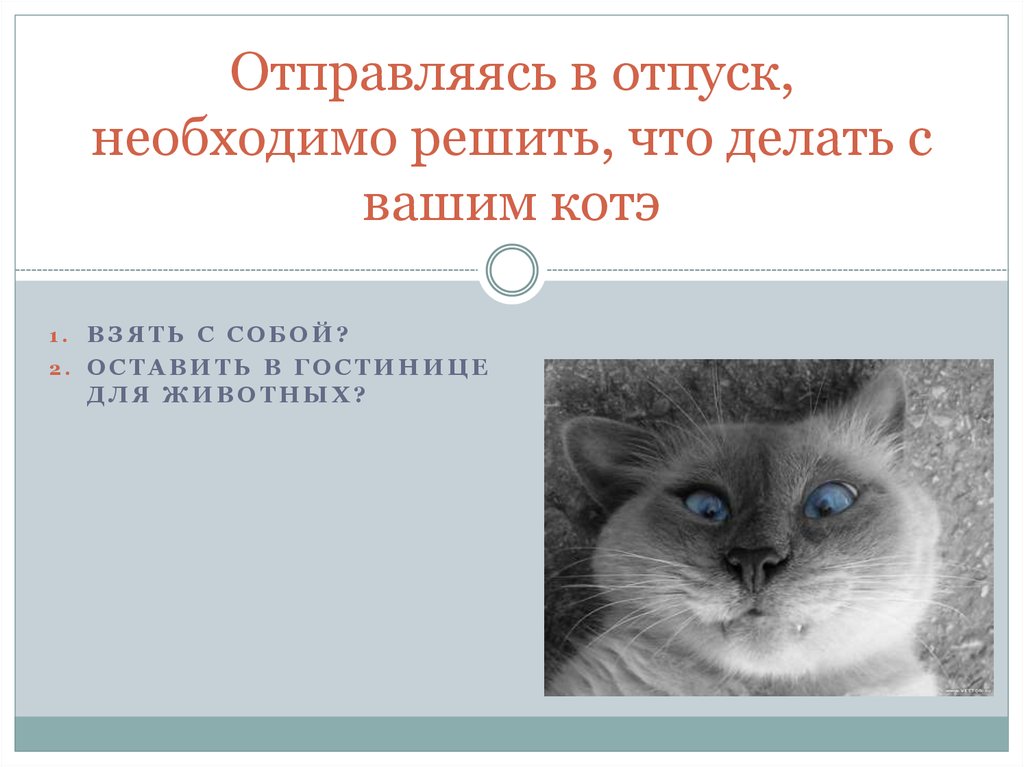 1. Отправляясь в отпуск, необходимо решить, что делать с вашим котэ