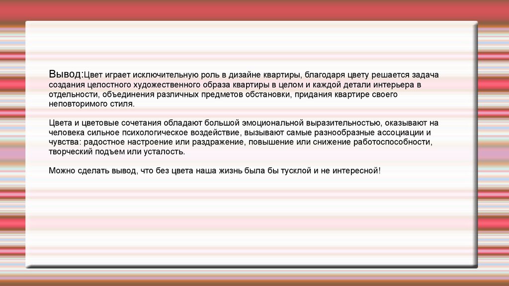 Вывод:Цвет играет исключительную роль в дизайне квартиры, благодаря цвету решается задачасоздания целостного художественного образа квартиры в целом и каждой детали интерьера в