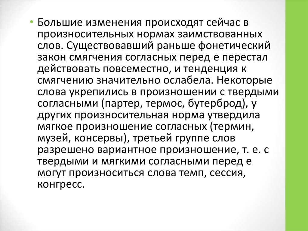 • Большие изменения происходят сейчас впроизносительных нормах заимствованных