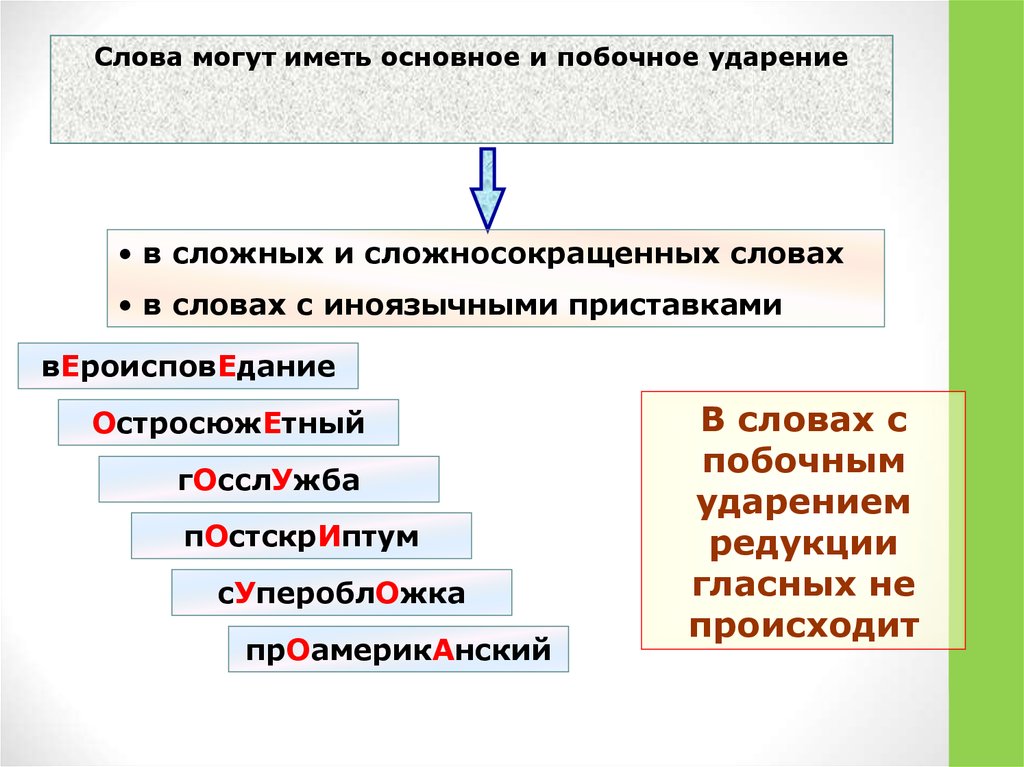 Слова могут иметь основное и побочное ударение• в сложных и сложносокращенных словах