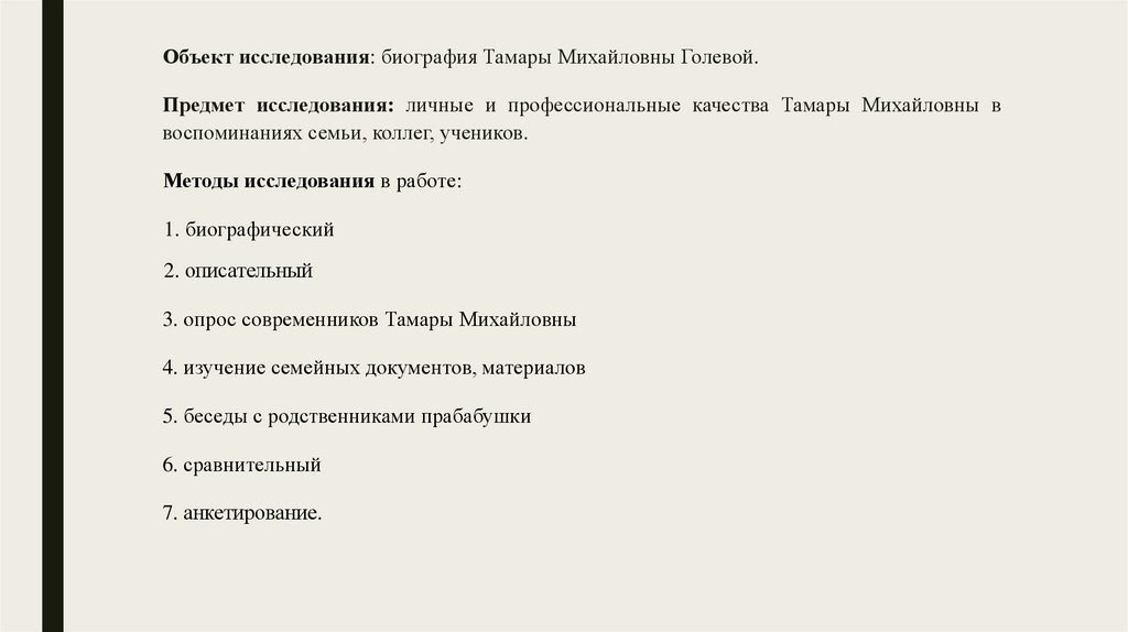 Объект исследования: биография Тамары Михайловны Голевой.Предмет исследования: личные и профессиональные качества Тамары Михайловны в