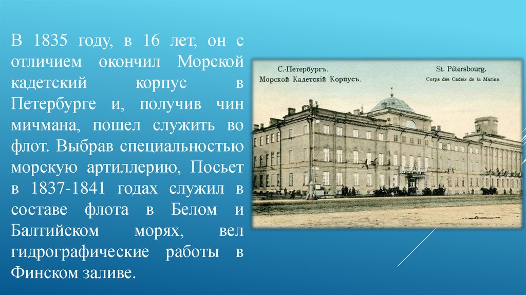 В 1835 году, в 16 лет, он сотличием окончил Морской