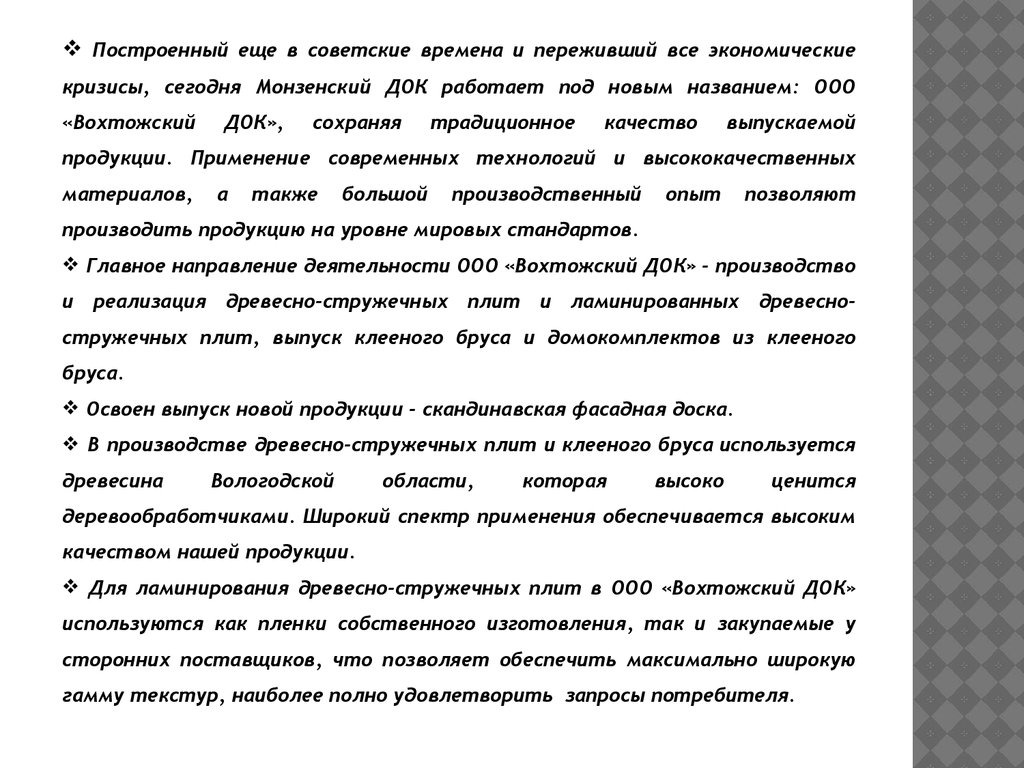 Построенный еще в советские времена и переживший все экономическиекризисы, сегодня Монзенский ДОК работает под новым названием: ООО