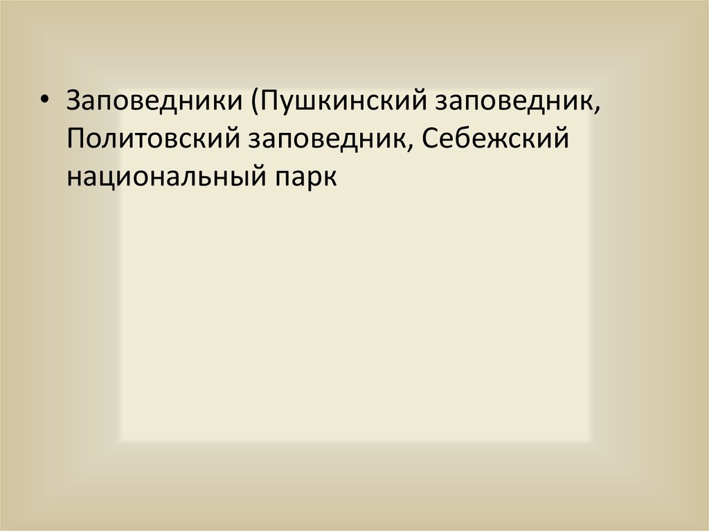 • Заповедники (Пушкинский заповедник,Политовский заповедник, Себежский