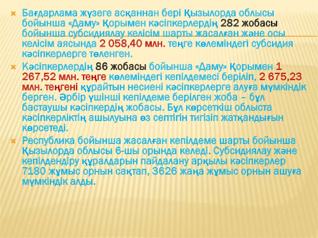 Бағдарлама жүзеге асқаннан бері Қызылорда облысыбойынша «Даму» Қорымен кәсіпкерлердің 282 жобасы