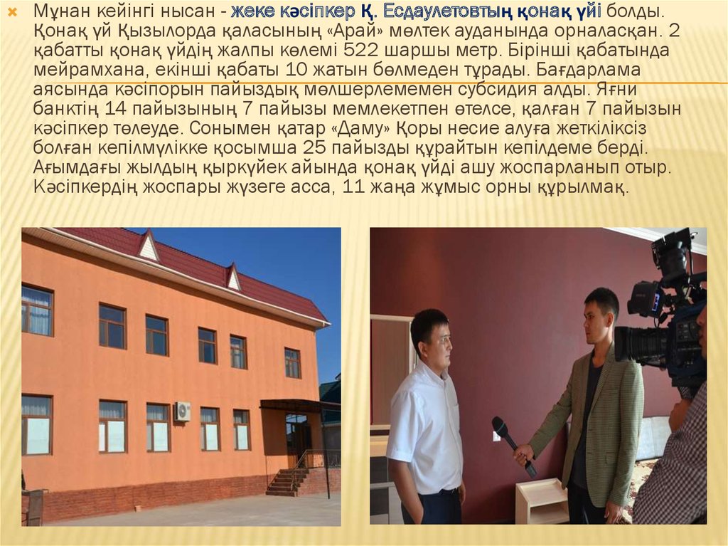Мұнан кейінгі нысан - жеке кәсіпкер Қ. Есдаулетовтың қонақ үйі болды.Қонақ үй Қызылорда қаласының «Арай» мөлтек ауданында орналасқан. 2