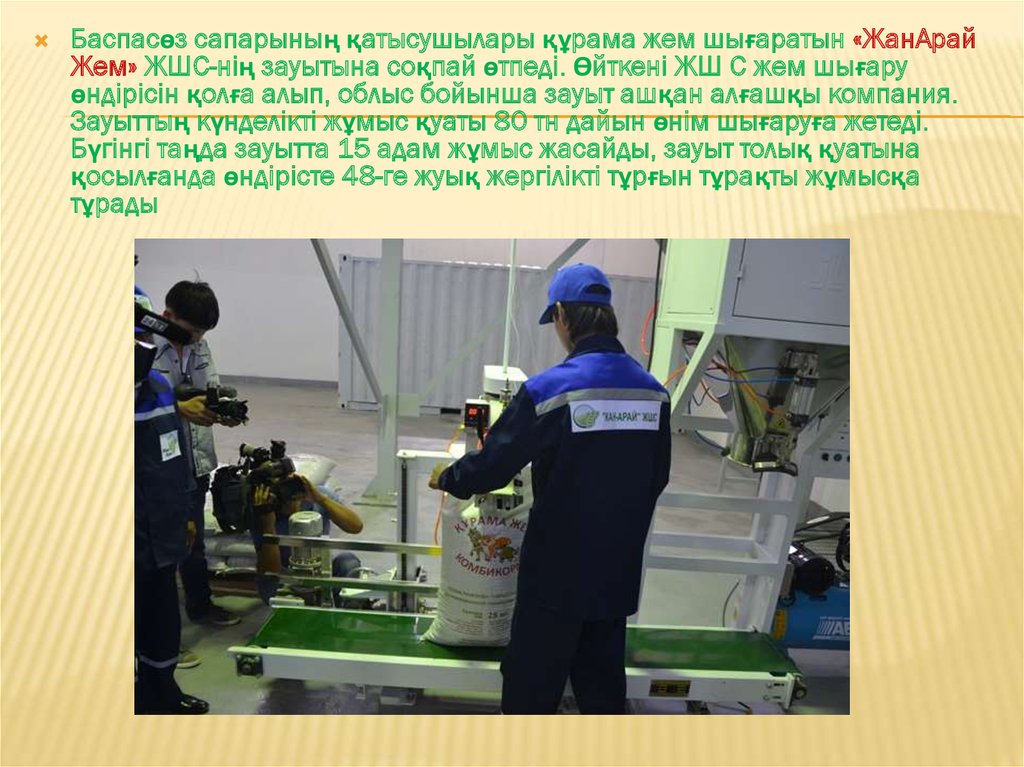 Баспасөз сапарының қатысушылары құрама жем шығаратын «ЖанАрайЖем» ЖШС-нің зауытына соқпай өтпеді. Өйткені ЖШ С жем шығару