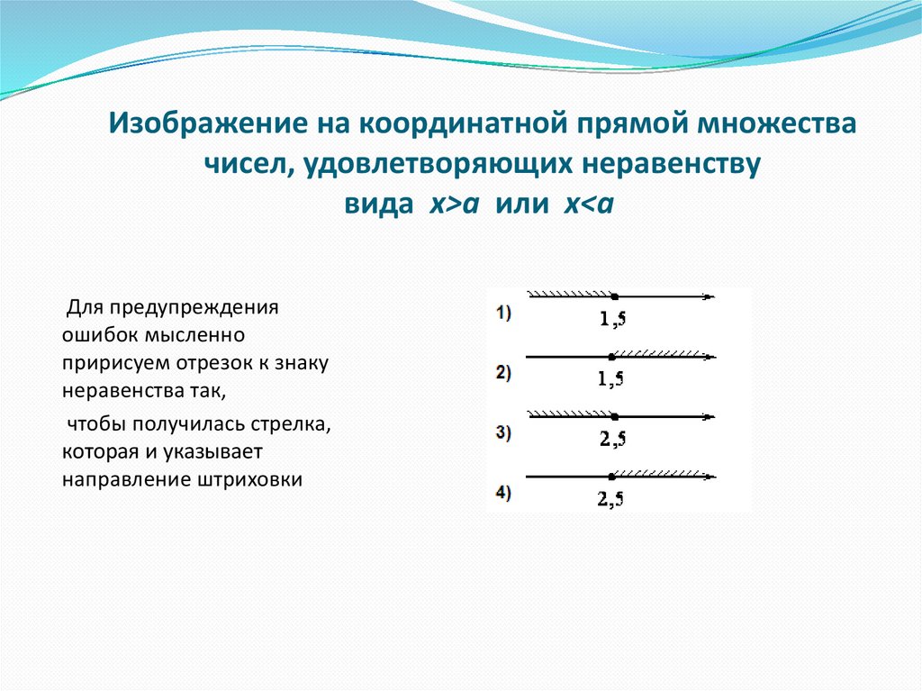Изображение на координатной прямой множествачисел, удовлетворяющих неравенству