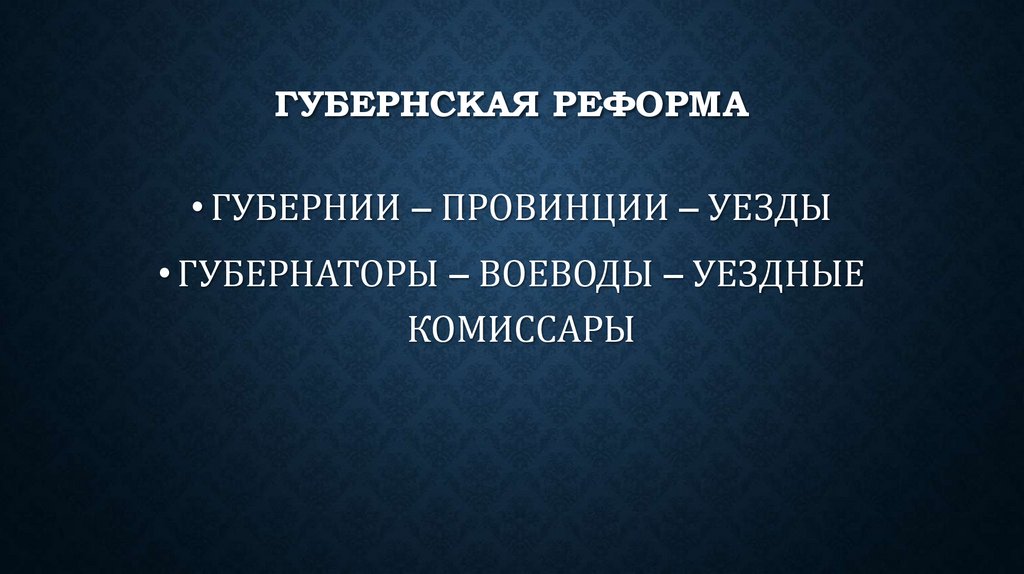 ГУБЕРНСКАЯ РЕФОРМА• ГУБЕРНИИ – ПРОВИНЦИИ – УЕЗДЫ