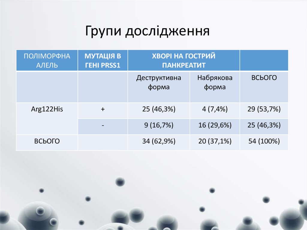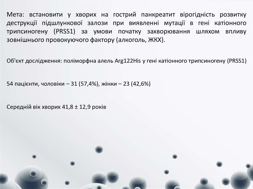 Об'єкт дослідження: поліморфна алель Arg122His у гені катіонного трипсиногену (PRSS1)
