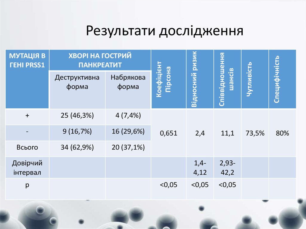 Мета: встановити у хворих на гострий панкреатит вірогідність розвиткудеструкції підшлункової залози при виявленні мутації в гені катіонного