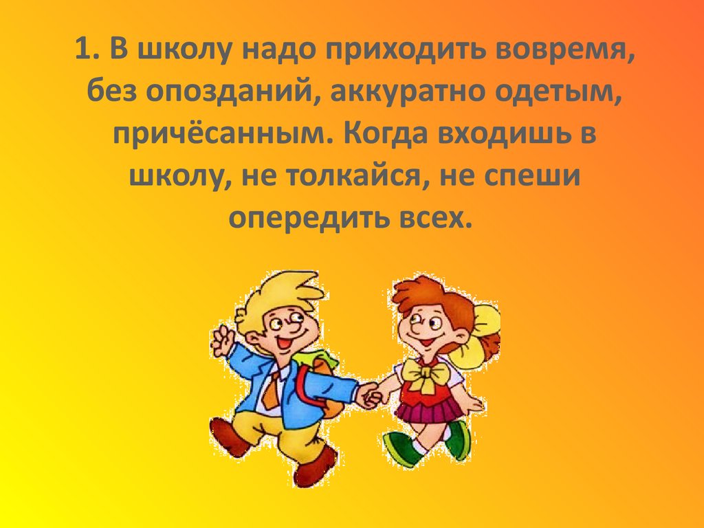 1. В школу надо приходить вовремя,без опозданий, аккуратно одетым,