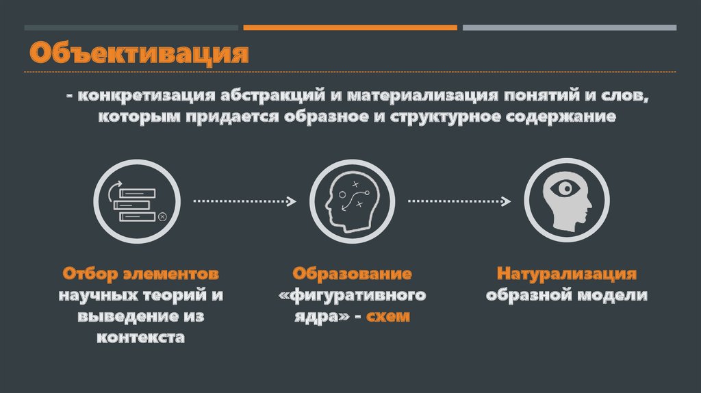 Объективация- конкретизация абстракций и материализация понятий и слов,