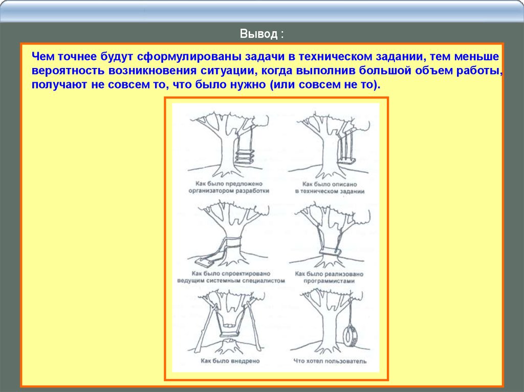 Вывод :Чем точнее будут сформулированы задачи в техническом задании, тем меньше