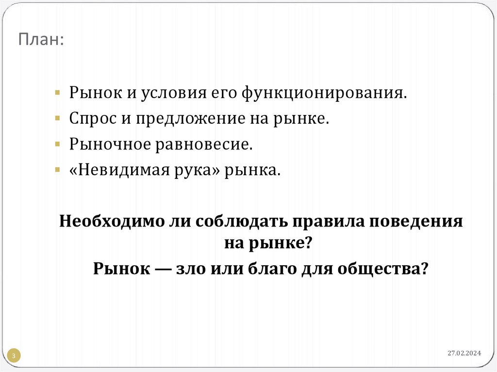 План:Рынок и условия его функционирования.