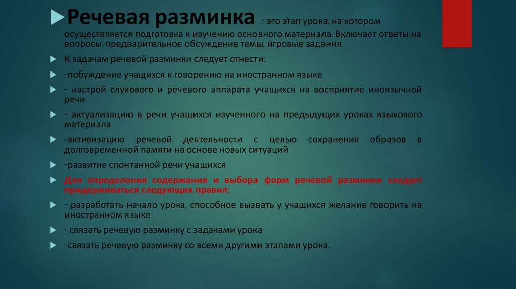 4. речевая зарядка, как правило, не должна занимать много времени (например, если это начало урока, то не