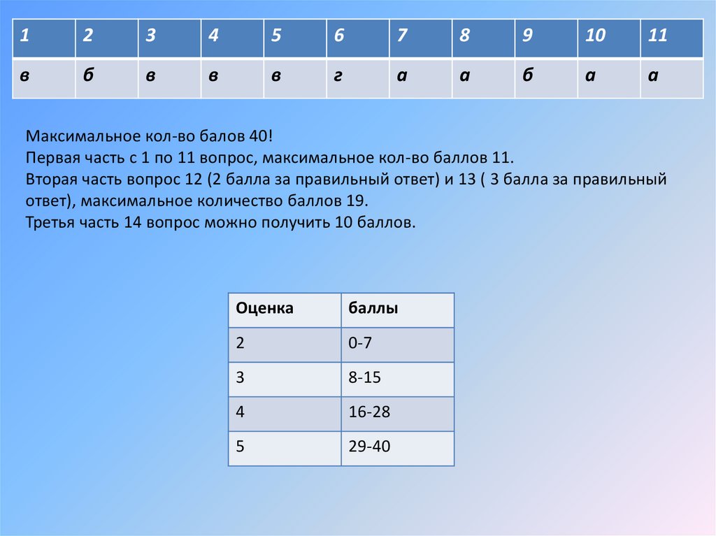 Первая часть с 1 по 11 вопрос, максимальное кол-во баллов 11.