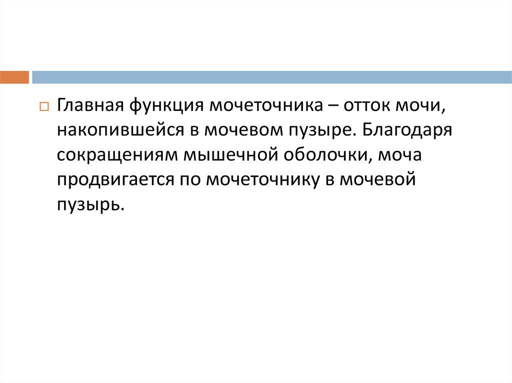 Главная функция мочеточника – отток мочи,накопившейся в мочевом пузыре. Благодаря
