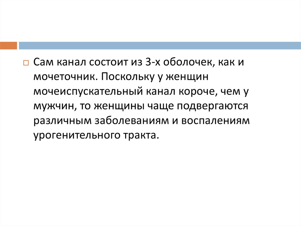 Сам канал состоит из 3-х оболочек, как имочеточник. Поскольку у женщин