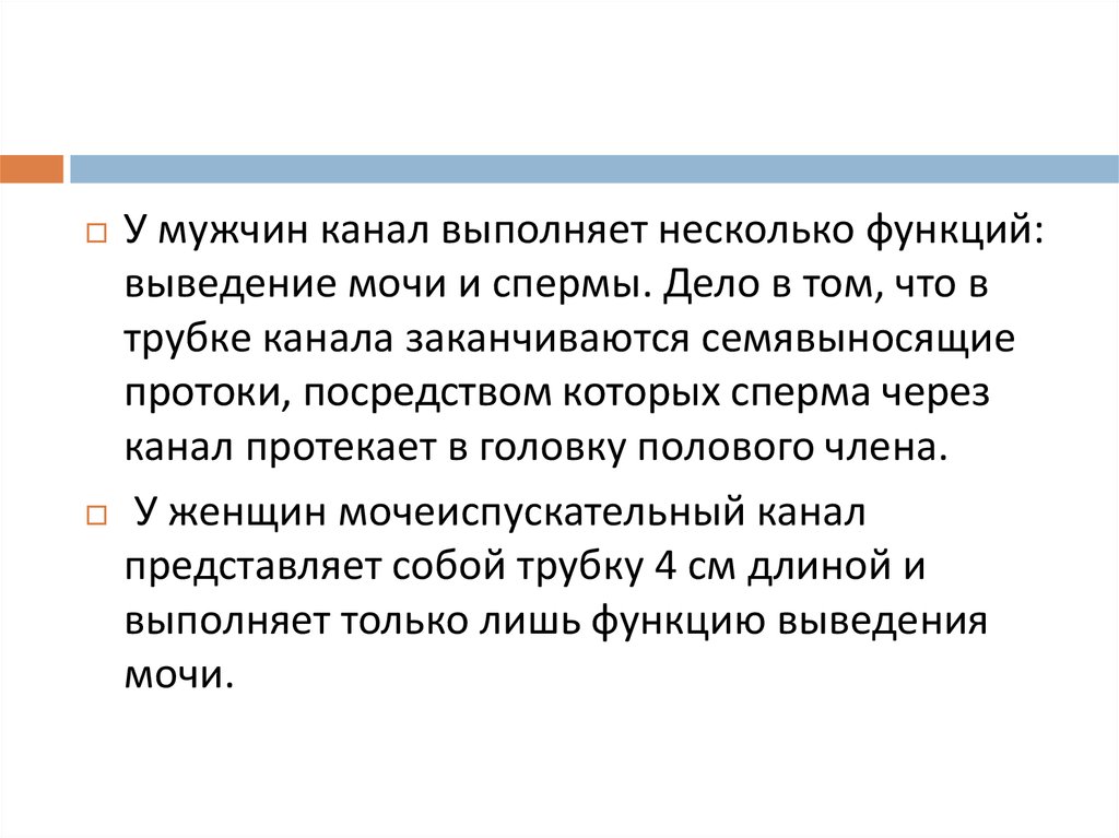У мужчин канал выполняет несколько функций:выведение мочи и спермы. Дело в том, что в