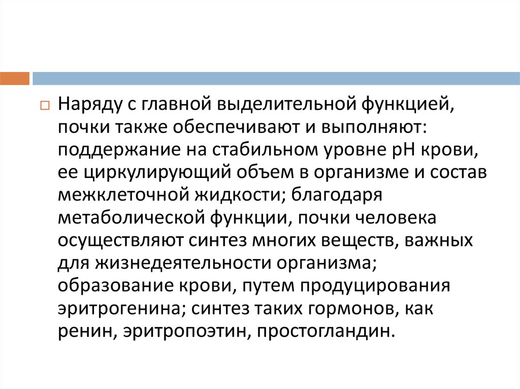 Наряду с главной выделительной функцией,почки также обеспечивают и выполняют: