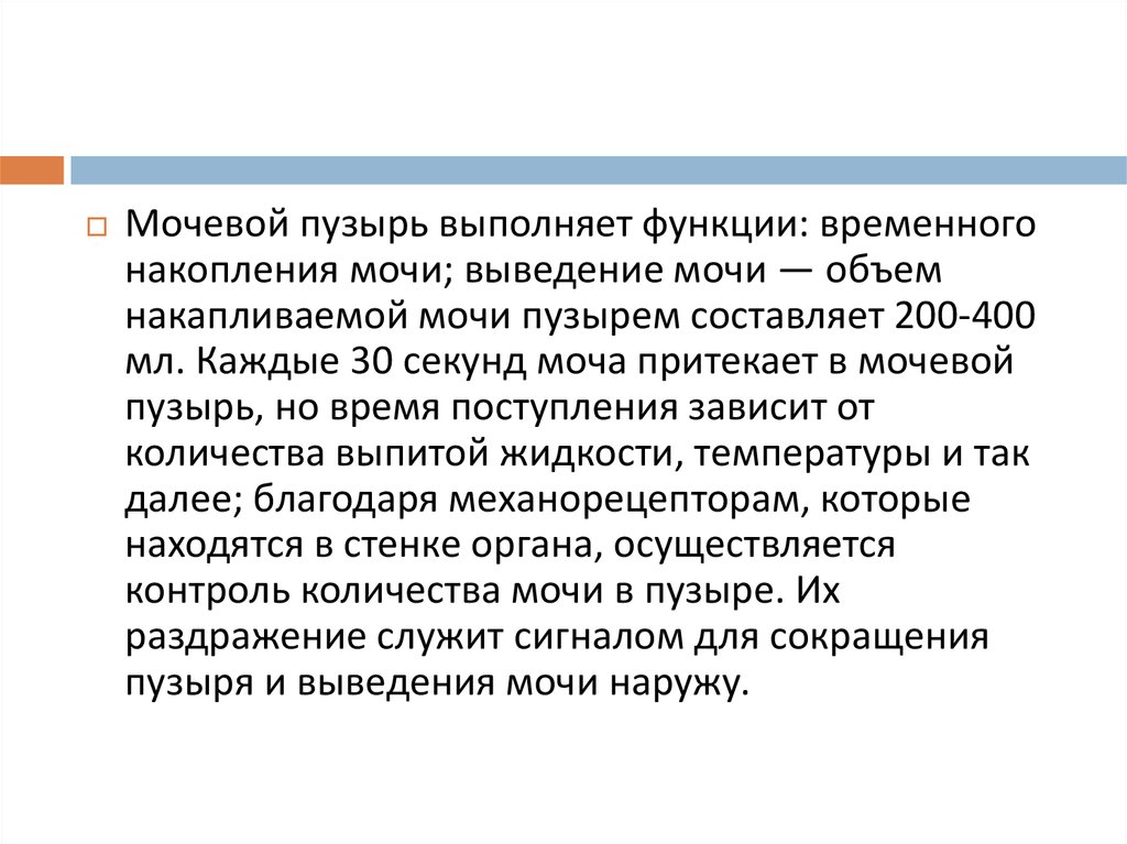 Мочевой пузырь выполняет функции: временногонакопления мочи; выведение мочи — объем