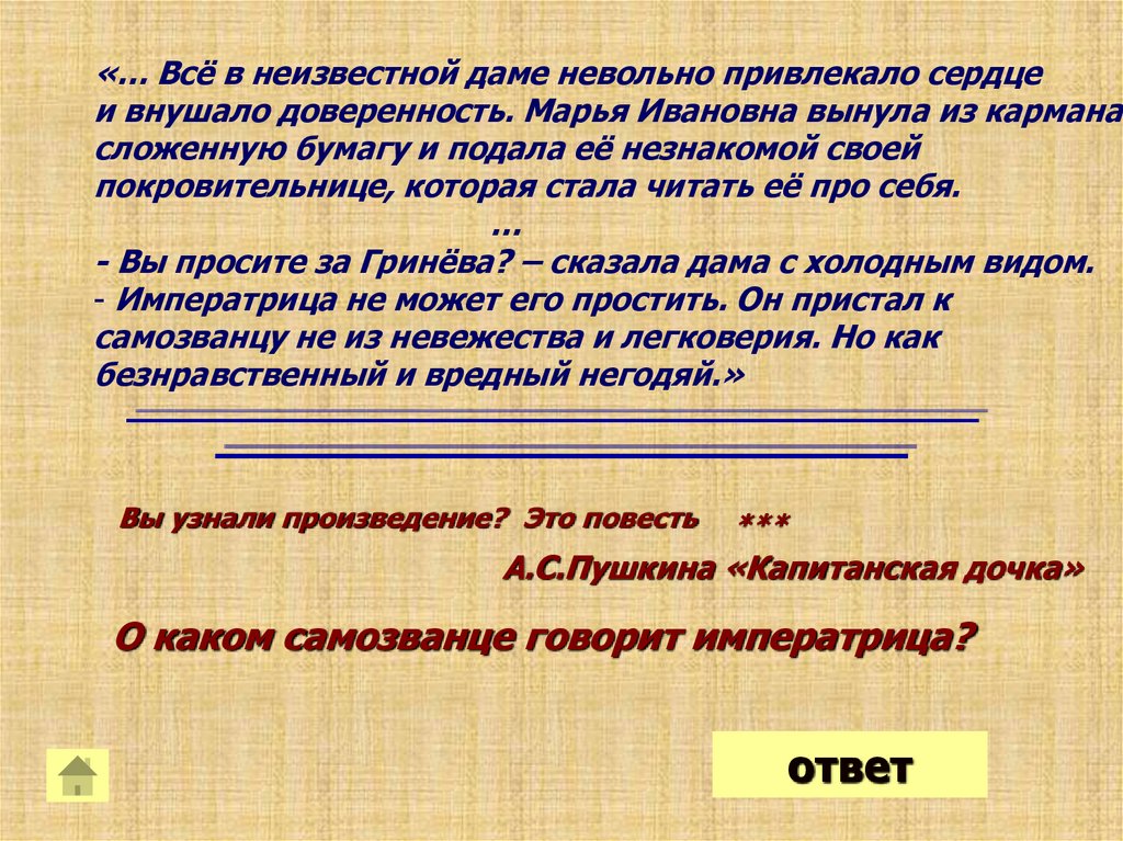 «… Всё в неизвестной даме невольно привлекало сердцеи внушало доверенность. Марья Ивановна вынула из кармана