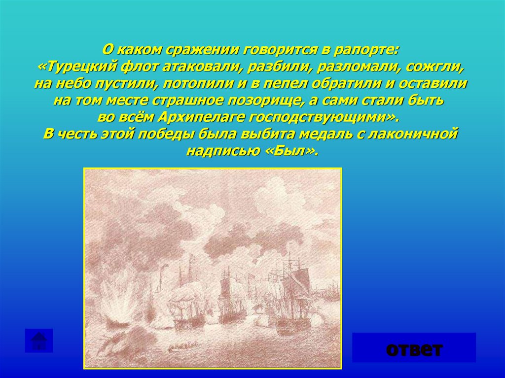 О каком сражении говорится в рапорте:«Турецкий флот атаковали, разбили, разломали, сожгли,