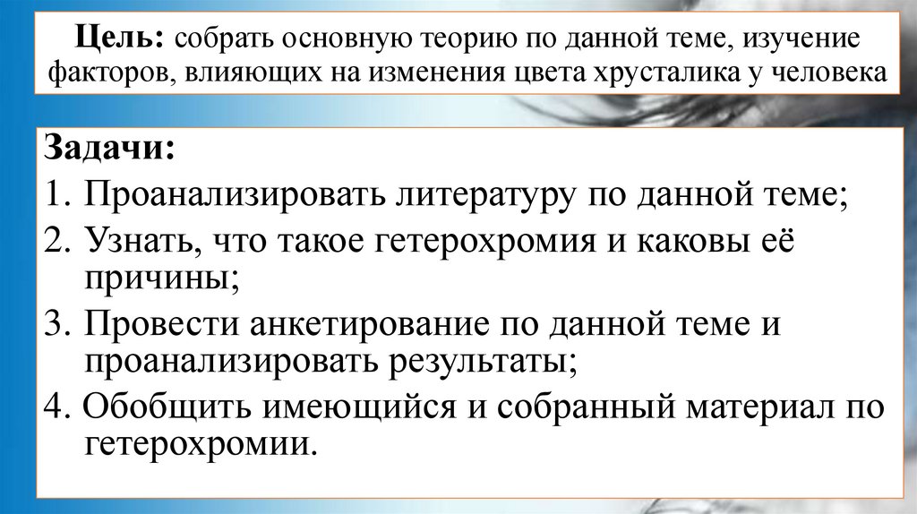 Цель: собрать основную теорию по данной теме, изучениефакторов, влияющих на изменения цвета хрусталика у человека