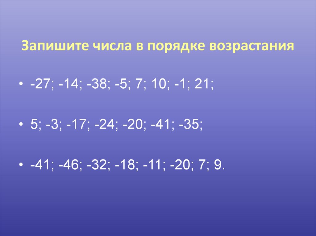 Запишите числа в порядке возрастания• -27; -14; -38; -5; 7; 10; -1; 21;