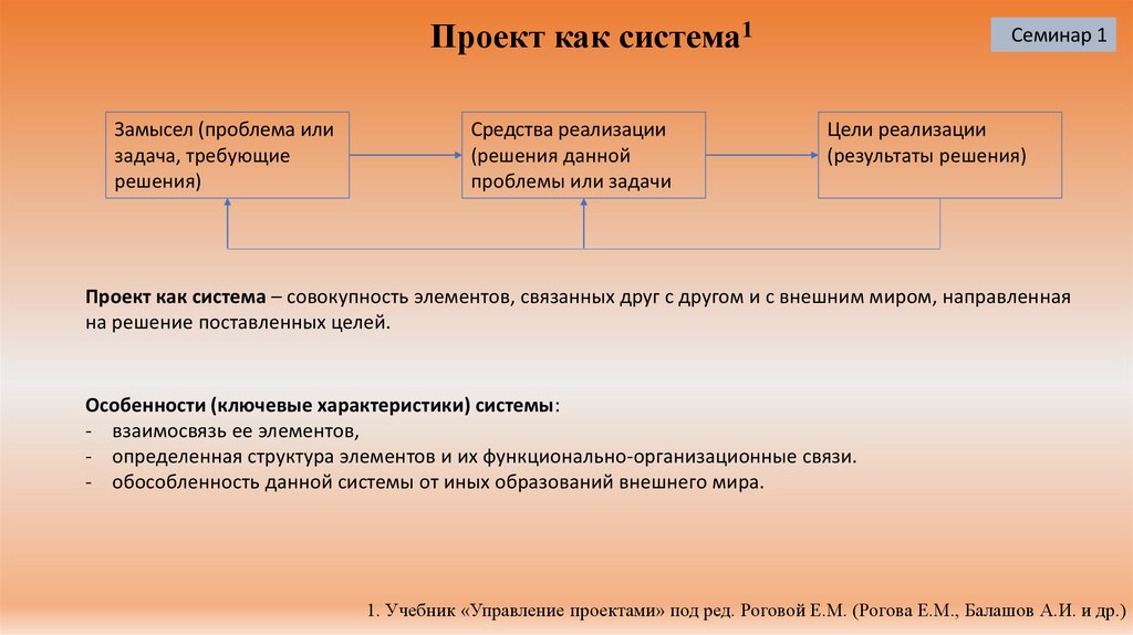 Проект как система1Проект как система – совокупность элементов, связанных друг с другом и с внешним миром, направленная