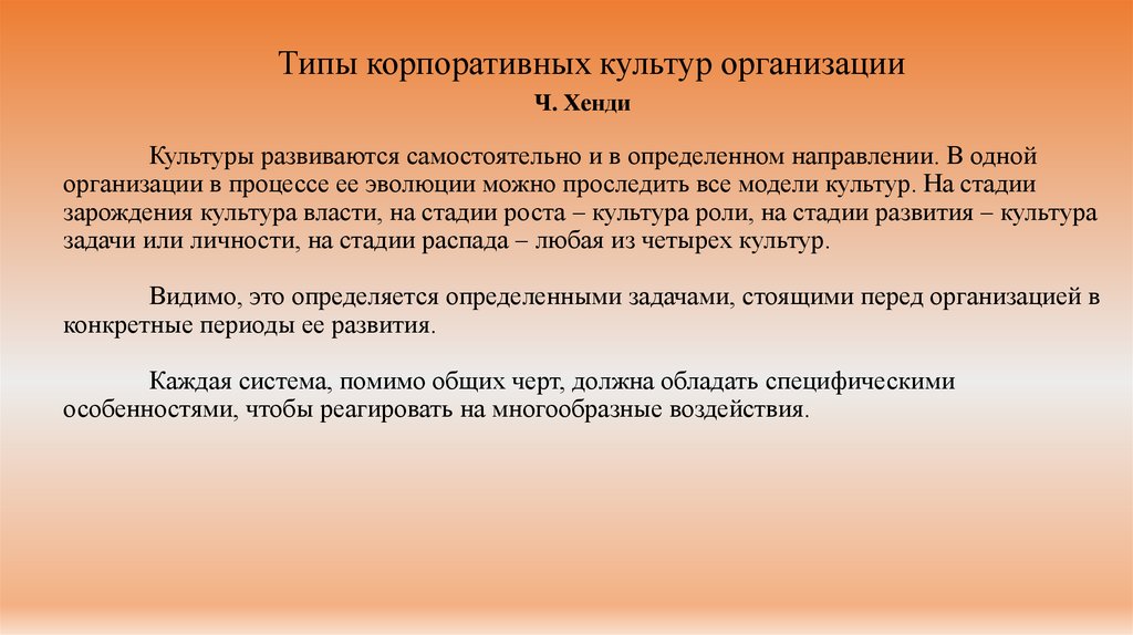 власти, на стадии роста – культура роли, на стадии развития –