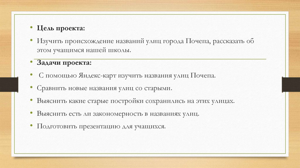 • Цель проекта:• Изучить происхождение названий улиц города Почепа, рассказать об