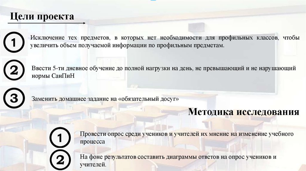 Цели проекта1) Исключение тех предметов, в которых нет необходимости для профильных классов, чтобы