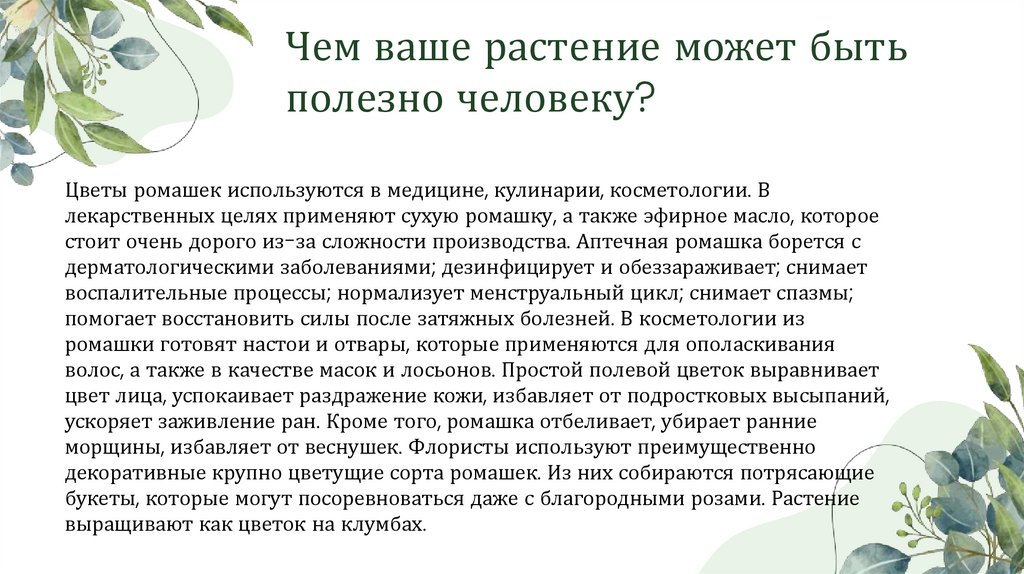 Цветы ромашек используются в медицине, кулинарии, косметологии. В