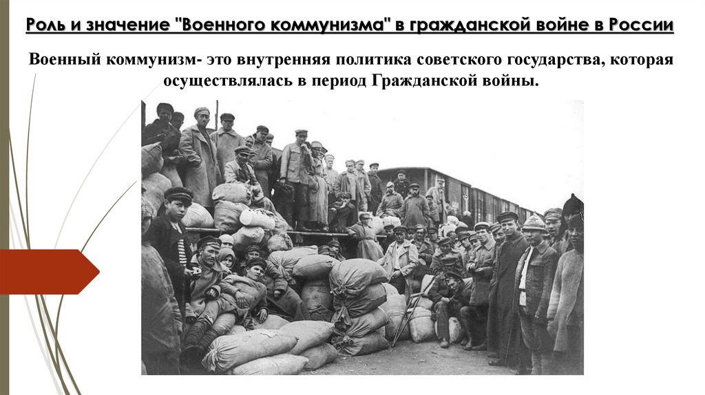 Роль и значение "Военного коммунизма" в гражданской войне в РоссииВоенный коммунизм- это внутренняя политика советского государства, которая