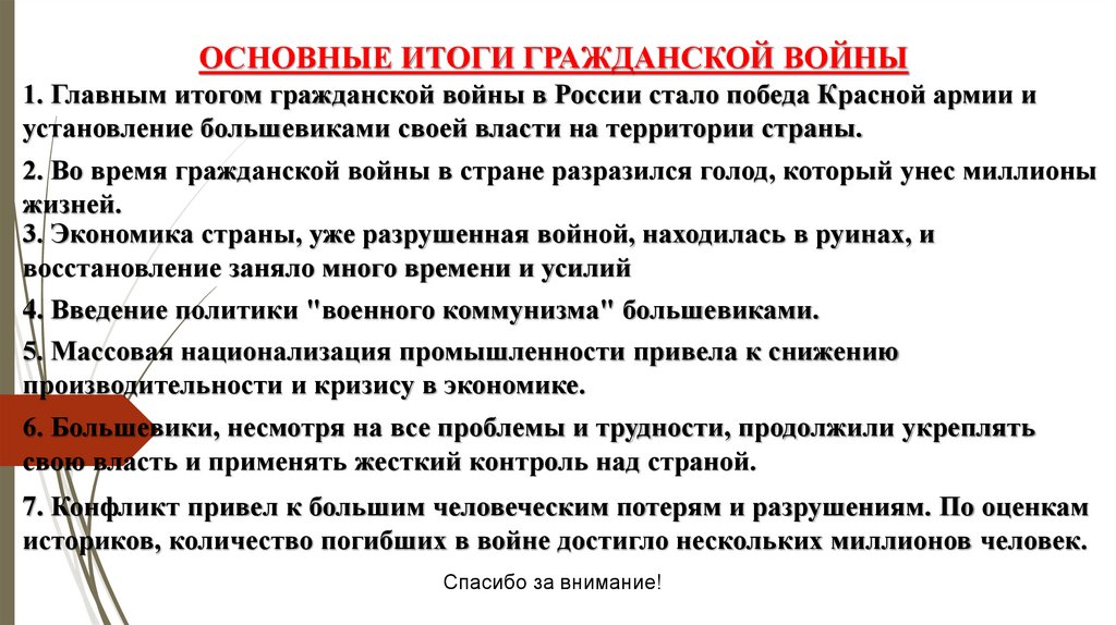 ОСНОВНЫЕ ИТОГИ ГРАЖДАНСКОЙ ВОЙНЫ1. Главным итогом гражданской войны в России стало победа Красной армии и