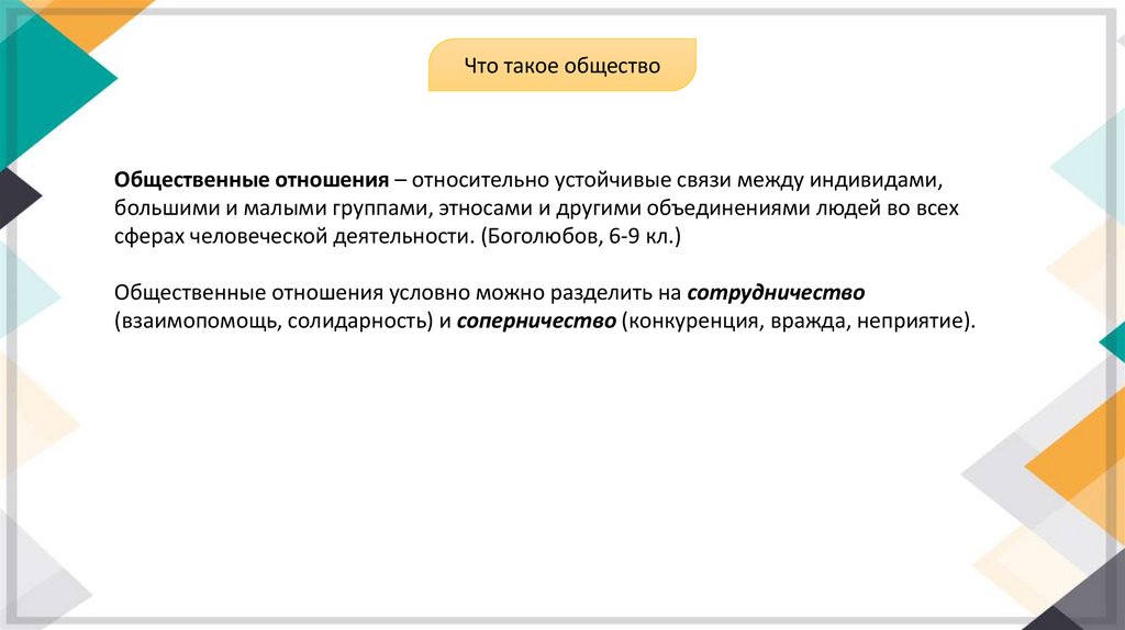 Что такое обществоОбщественные отношения – относительно устойчивые связи между индивидами,