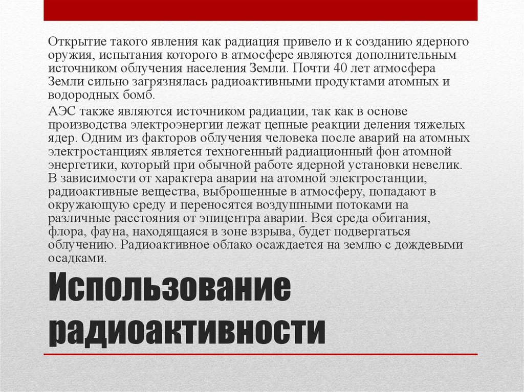 Открытие такого явления как радиация привело и к созданию ядерногооружия, испытания которого в атмосфере являются дополнительным